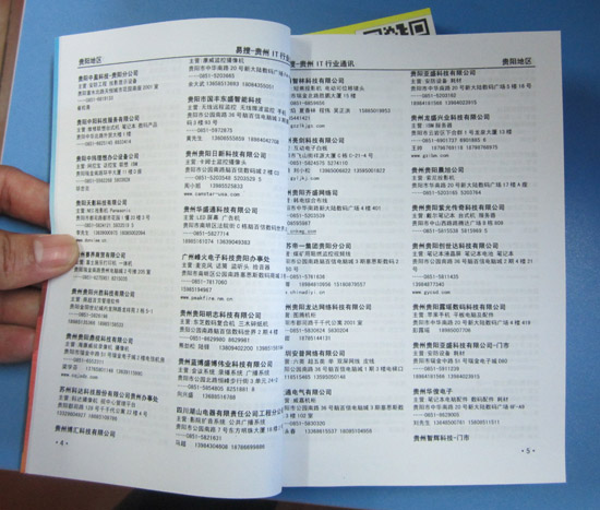 这本书编辑前期由易搜专人到贵州省各市、地方县的IT数码城、路边及大厦挨家挨户进行名片收集,包含有电话,手机、网址、联系人等信息。(QQ版本也可以专门订制,详见易搜商城)